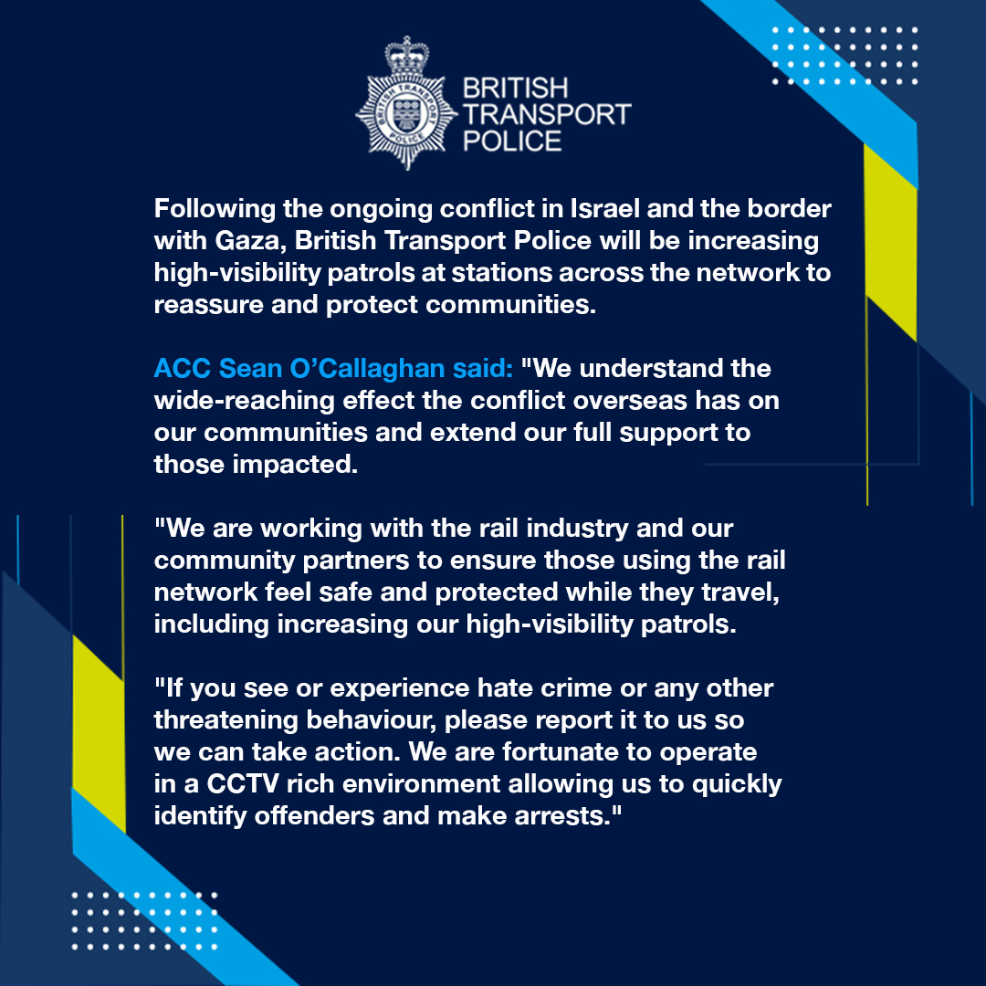 Statement from British Transport Police (BTP): Following the ongoing conflict in Israel and the border with Gaza, British Transport Police will be increasing high-visibility patrols at stations across the network to reassure and protect communities.